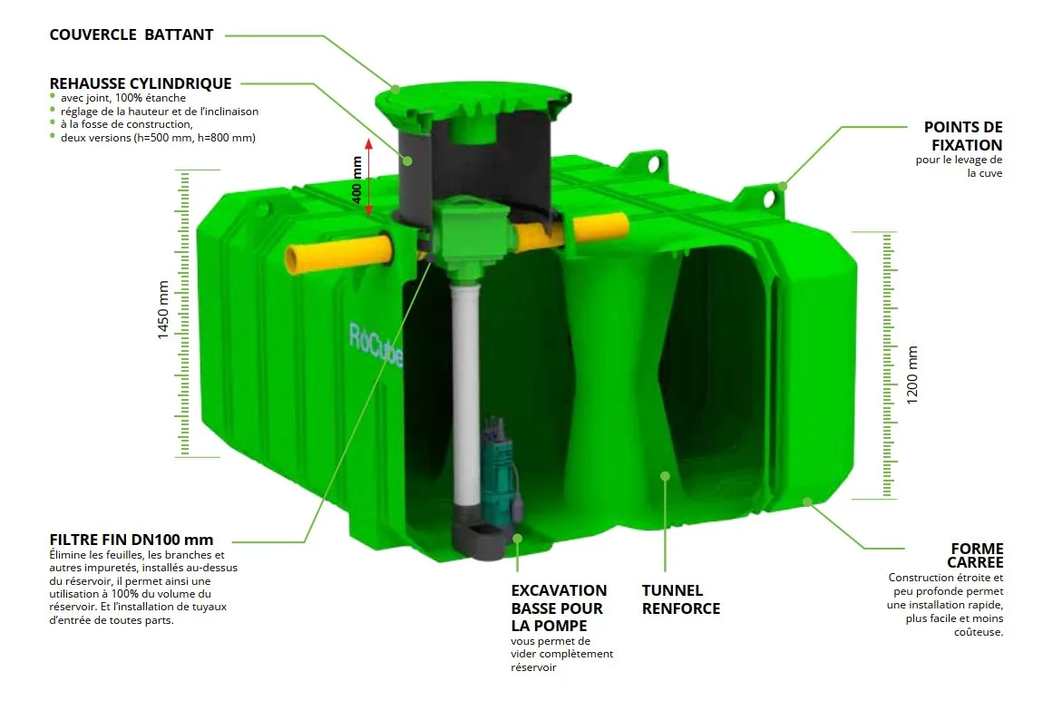 Les cuves plates ROCUBE, disponibles en capacités de 5 000 L à 15 000 L, constituent une solution idéale pour le stockage pratique et efficace de l’eau de pluie. Conçues pour répondre aux besoins des professionnels et des particuliers, elles se distinguent par leur design compact qui réduit considérablement la profondeur d’installation. Résultat ? Des travaux de terrassement simplifiés, un gain de temps, et une réduction significative des coûts.